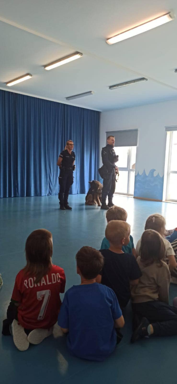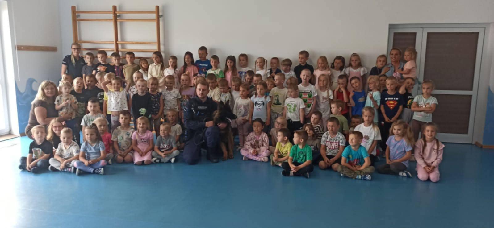 Policjanci z KPP Kamień Pomorski odwiedzili nasze przedszkole – prelekcja o bezpiecznych wakacjach z udziałem policyjnego psa Tuż przed rozpoczęciem wakacji nasze przedszkole odwiedzili wyjątkowi goście – funkcjonariusze Komendy Powiatowej Policji w Kamieniu Pomorskim. Spotkanie miało charakter edukacyjny i poświęcone było tematyce bezpiecznych wakacji. W prelekcji udział wzięły wszystkie grupy przedszkolne, a towarzyszyła jej niespodzianka, która szczególnie ucieszyła dzieci – policyjny pies służbowy wraz ze swoim przewodnikiem. Policjanci w przystępny i ciekawy sposób opowiadali najmłodszym o zasadach bezpieczeństwa podczas letniego wypoczynku – zarówno nad wodą, jak i podczas zabawy na podwórku czy spacerów z rodziną. Poruszyli także temat bezpiecznego poruszania się po drogach, przypominając o konieczności noszenia elementów odblaskowych oraz uważnego przechodzenia przez jezdnię. Największe zainteresowanie wzbudził pokaz umiejętności policyjnego psa, który zaprezentował swoje zdolności w posłuszeństwie i reagowaniu na komendy. Dzieci mogły z bliska zobaczyć, jak wygląda praca czworonożnego funkcjonariusza i dowiedzieć się, jak psy pomagają policji w codziennej służbie. Spotkanie przebiegło w miłej atmosferze i zakończyło się wspólnym zdjęciem oraz podziękowaniami dla funkcjonariuszy. Była to nie tylko świetna zabawa, ale również cenna lekcja, która z pewnością zostanie w pamięci dzieci na długo. Serdecznie dziękujemy policjantom z Komendy Powiatowej Policji w Kamieniu Pomorskim za zaangażowanie i czas poświęcony naszym przedszkolakom. Mamy nadzieję, że to nie ostatnie takie spotkanie!
