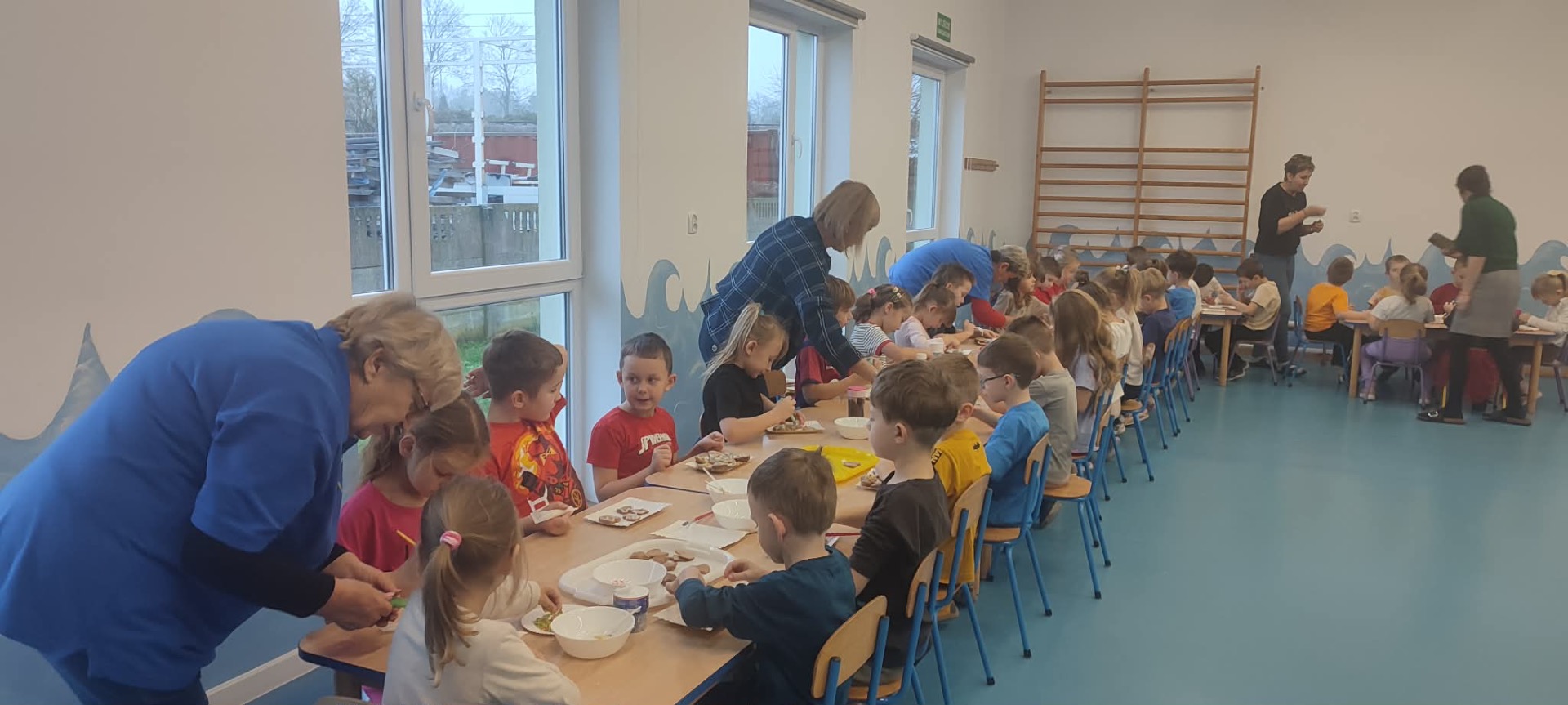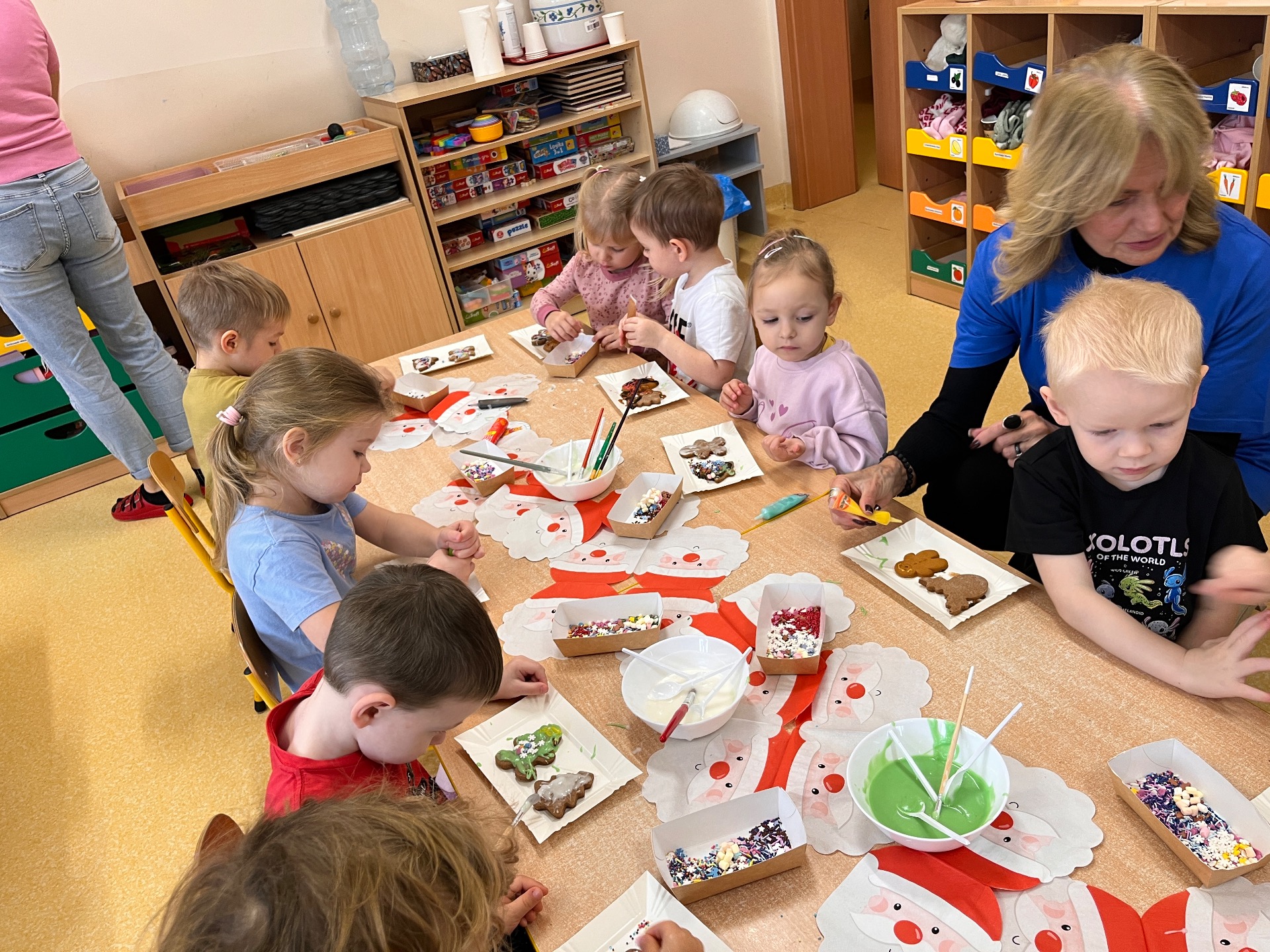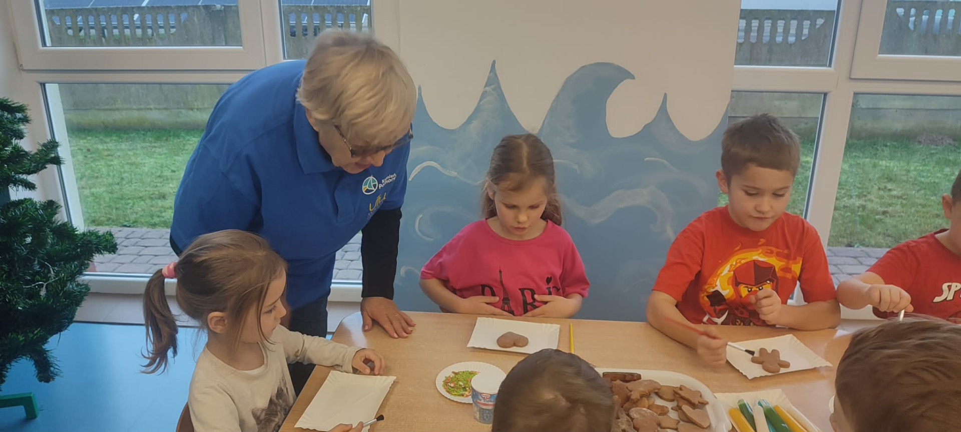 W przedświątecznej atmosferze w naszym przedszkolu odbyło się wyjątkowe wydarzenie – warsztaty dekorowania pierników z udziałem wolontariuszy Uniwersytetu Trzeciego Wieku. Tego dnia przedszkolna sala zamieniła się w prawdziwą piernikową fabrykę, pełną zapachu korzennych przypraw, kolorowych lukrów i radosnego śmiechu dzieci. W zajęciach wzięły udział przedszkolaki z grup Żabek, Duszków, Krasnali, Misiów i Biedronek. Dzieci z ogromnym entuzjazmem przystąpiły do pracy, dekorując pierniki według własnych pomysłów. Na stołach pojawiły się gwiazdki, serduszka, choinki i aniołki, a każdy piernik był małym dziełem sztuki. Wolontariusze UTW z wielką cierpliwością i serdecznością pomagali dzieciom, dzieląc się swoim doświadczeniem i ciepłem. Wspólna praca była nie tylko okazją do rozwijania zdolności manualnych i kreatywności najmłodszych, ale także pięknym przykładem międzypokoleniowej współpracy.