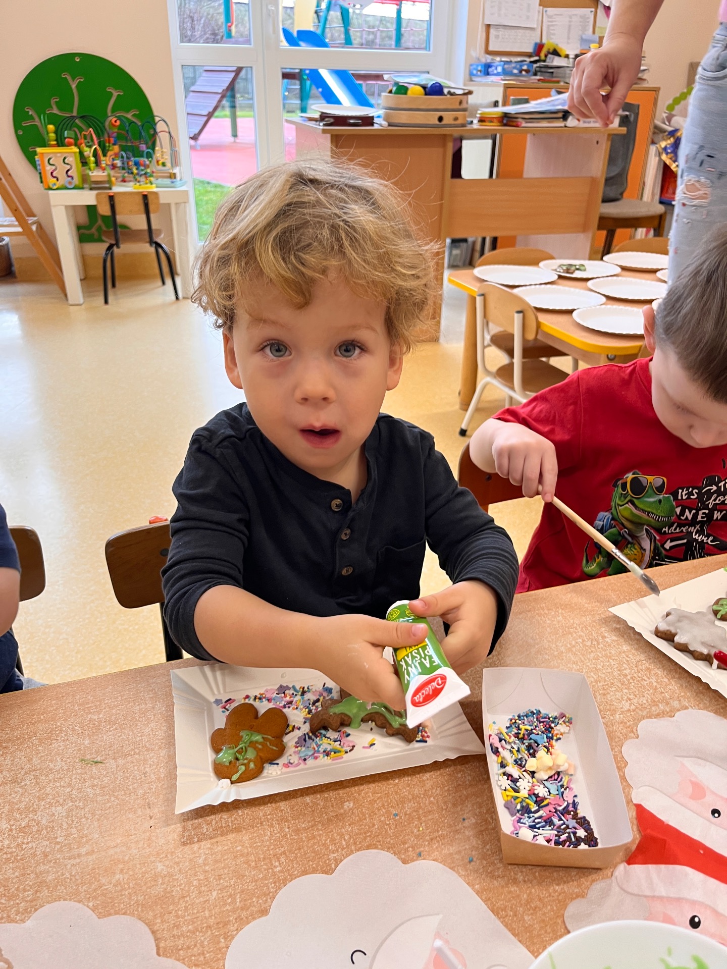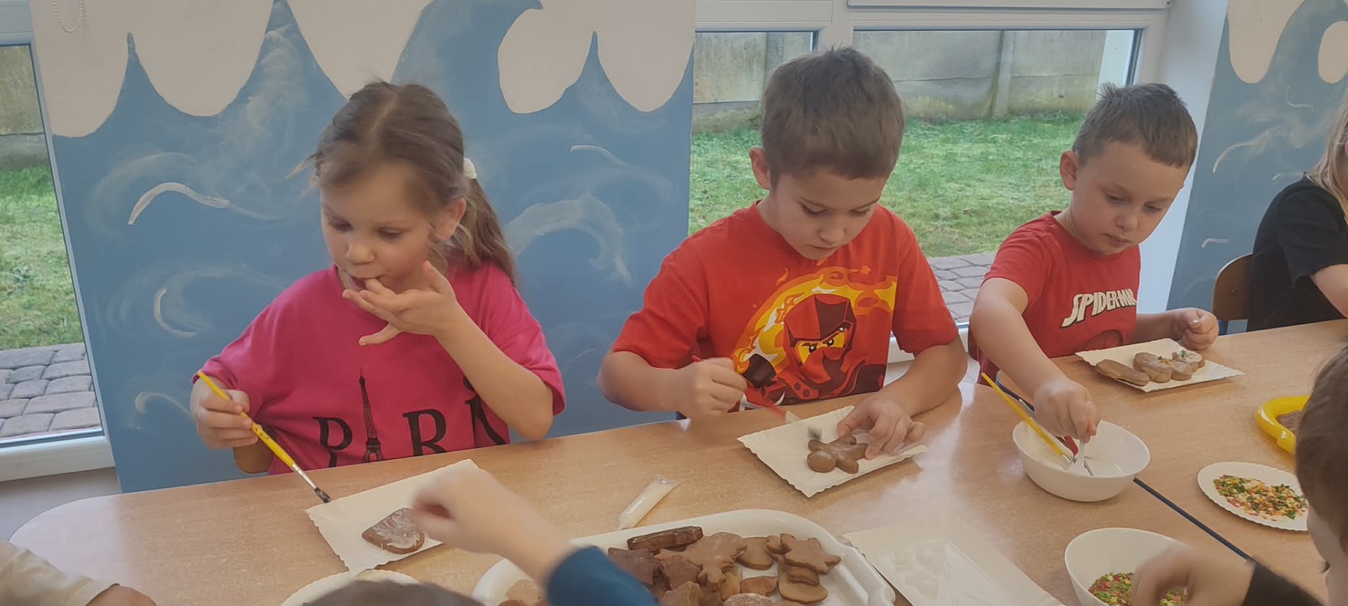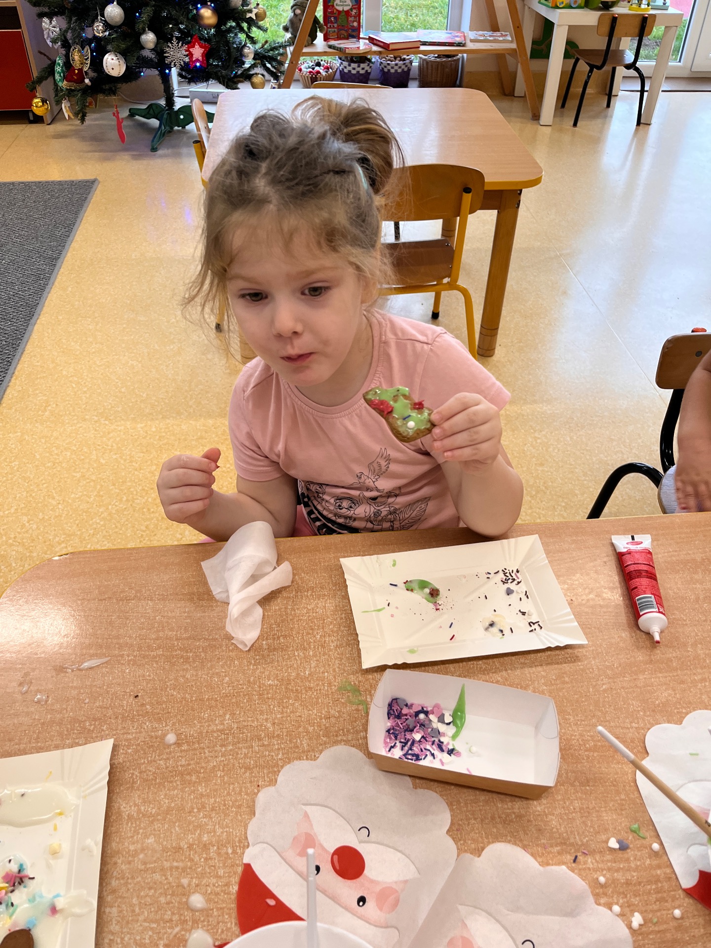W przedświątecznej atmosferze w naszym przedszkolu odbyło się wyjątkowe wydarzenie – warsztaty dekorowania pierników z udziałem wolontariuszy Uniwersytetu Trzeciego Wieku. Tego dnia przedszkolna sala zamieniła się w prawdziwą piernikową fabrykę, pełną zapachu korzennych przypraw, kolorowych lukrów i radosnego śmiechu dzieci. W zajęciach wzięły udział przedszkolaki z grup Żabek, Duszków, Krasnali, Misiów i Biedronek. Dzieci z ogromnym entuzjazmem przystąpiły do pracy, dekorując pierniki według własnych pomysłów. Na stołach pojawiły się gwiazdki, serduszka, choinki i aniołki, a każdy piernik był małym dziełem sztuki. Wolontariusze UTW z wielką cierpliwością i serdecznością pomagali dzieciom, dzieląc się swoim doświadczeniem i ciepłem. Wspólna praca była nie tylko okazją do rozwijania zdolności manualnych i kreatywności najmłodszych, ale także pięknym przykładem międzypokoleniowej współpracy.