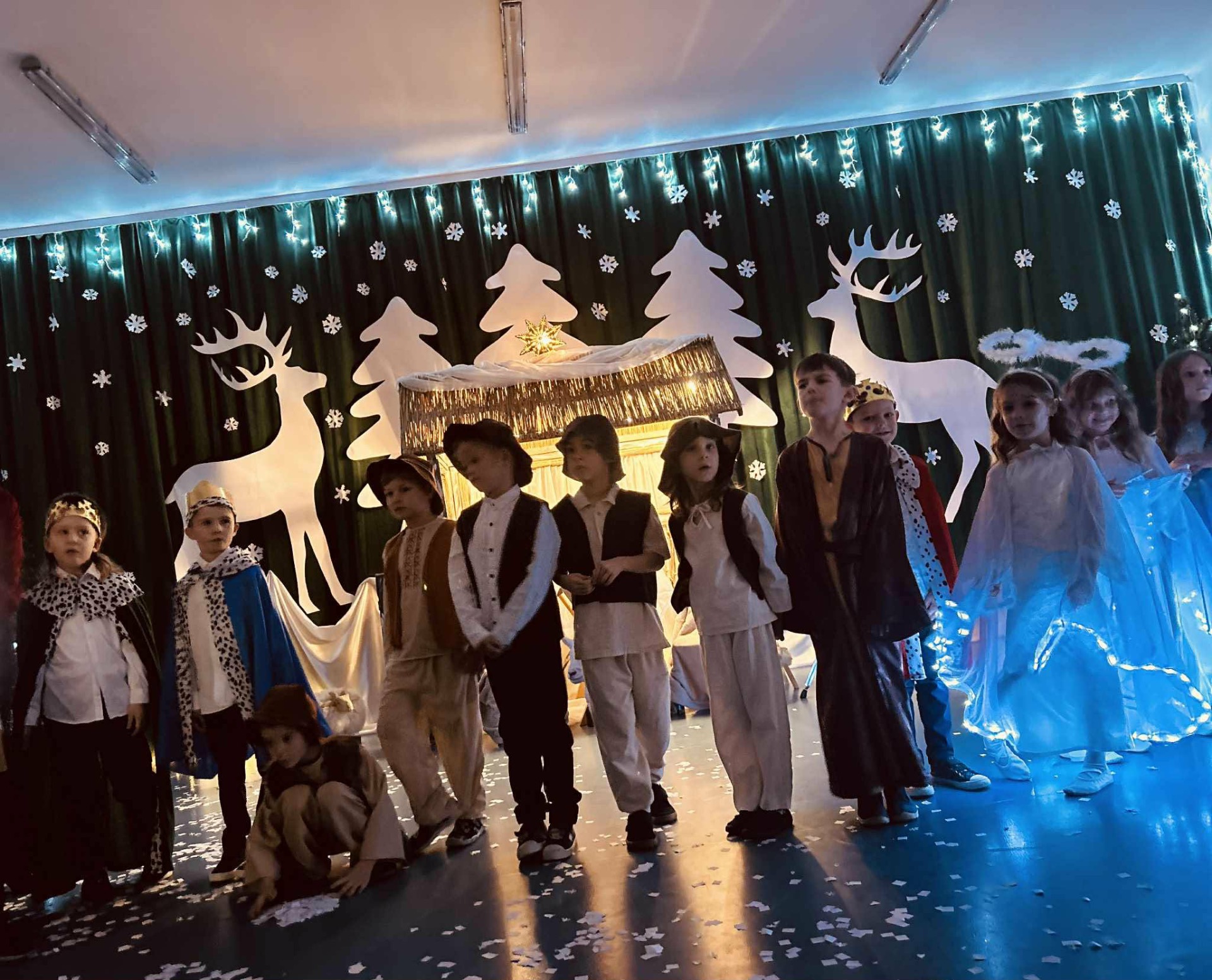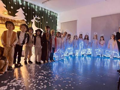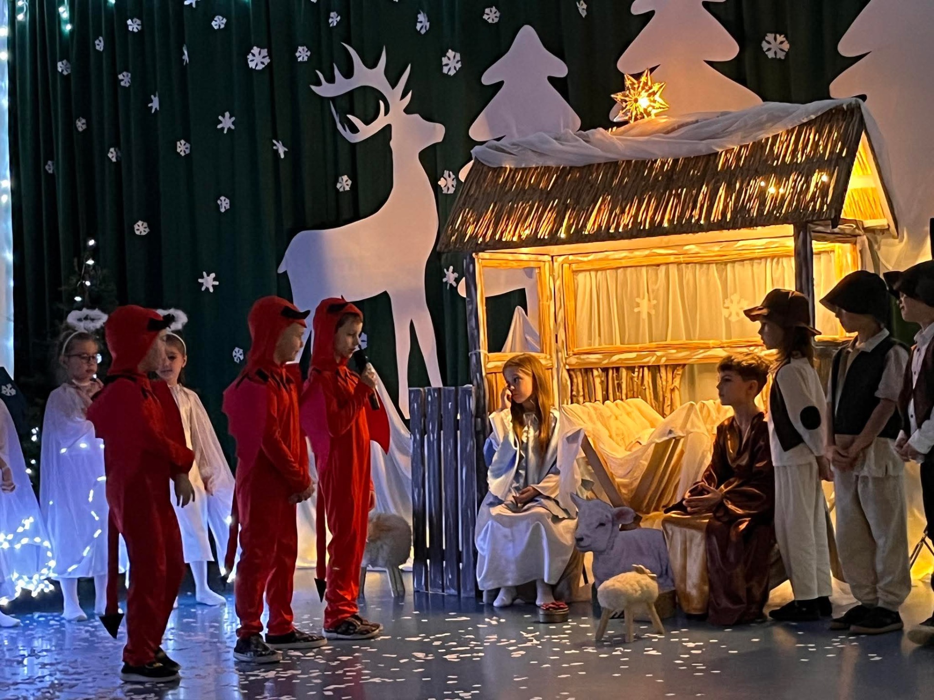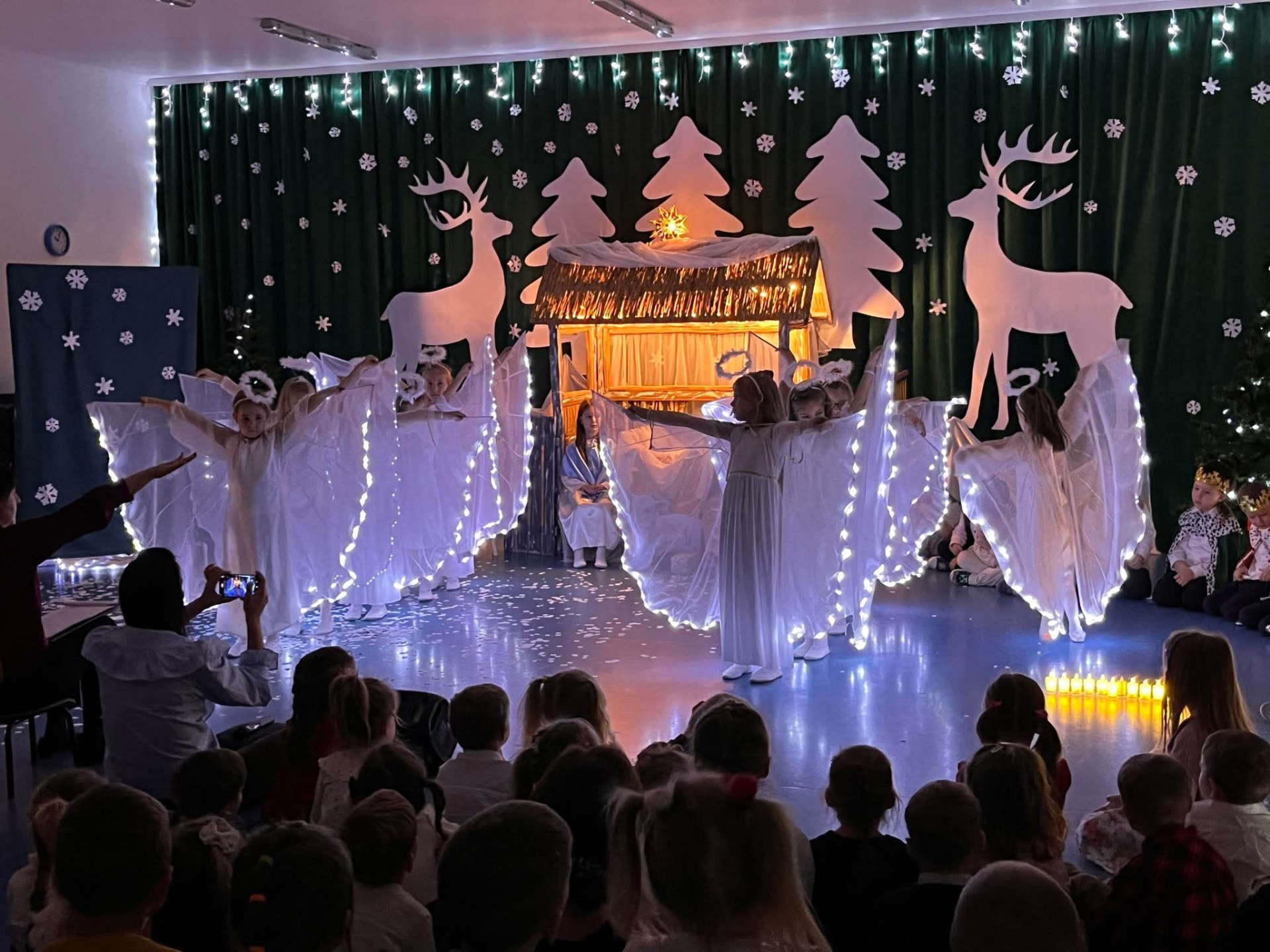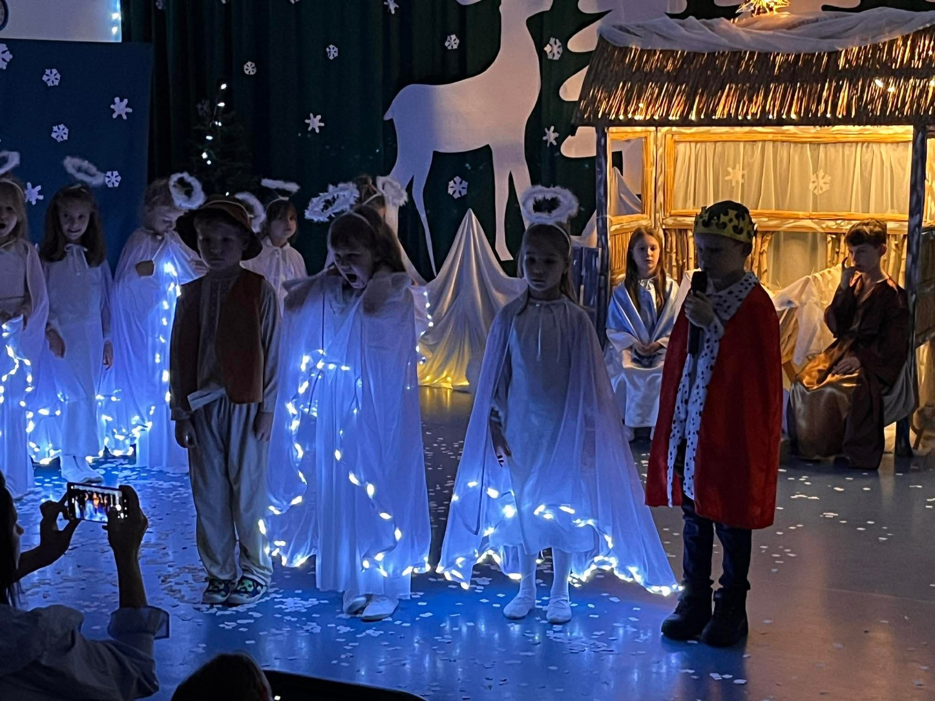 Dnia 16 i 17.12. odbyły się Jasełka przygotowane przez grupę Żabki. Dzieci swoje umiejętności zaprezentowały swoim kolegom i koleżankom z grup przedszkolnych, a także dla pracowników przedszkola. Kolejnego dnia 17.12 rozpoczęto Jasełka dla rodziców. Złożone przez Panią Dyrektor życzenia i to niezwykłe wydarzenie wprowadziły wszystkich zgromadzonych w radosny, wzruszający świąteczny nastrój i stało się okazją do wspólnego przeżywania magii Bożego Narodzenia. Mali artyści z wielkim zaangażowaniem wcielili się w swoje role, prezentując piękne wiersze, pastorałki oraz sceny nawiązujące do narodzin Jezusa. Dzieci zachwyciły publiczność nie tylko doskonałym przygotowaniem, ale także naturalnością, odwagą i szczerością, z jaką występowały na scenie. Wyjątkowym zaszczytem dla naszej społeczności była obecność Burmistrza Miasta Kamienia Pomorskiego, pana Stanisława Kuryłło, który z uwagą obejrzał przedstawienie i skierował do dzieci oraz nauczycieli ciepłe słowa uznania. Podziękował najmłodszym za piękny występ, a wychowawcom za trud włożony w przygotowanie uroczystości. Jasełka były nie tylko artystycznym wydarzeniem, ale także ważną lekcją tradycji, współpracy i wzajemnej życzliwości. Wspólne kolędowanie oraz świąteczna atmosfera na długo pozostaną w naszej pamięci. Serdecznie dziękujemy dzieciom z grupy „Żabek” oraz wszystkim gościom za obecność i wspólne przeżywanie tego wyjątkowego czasu.